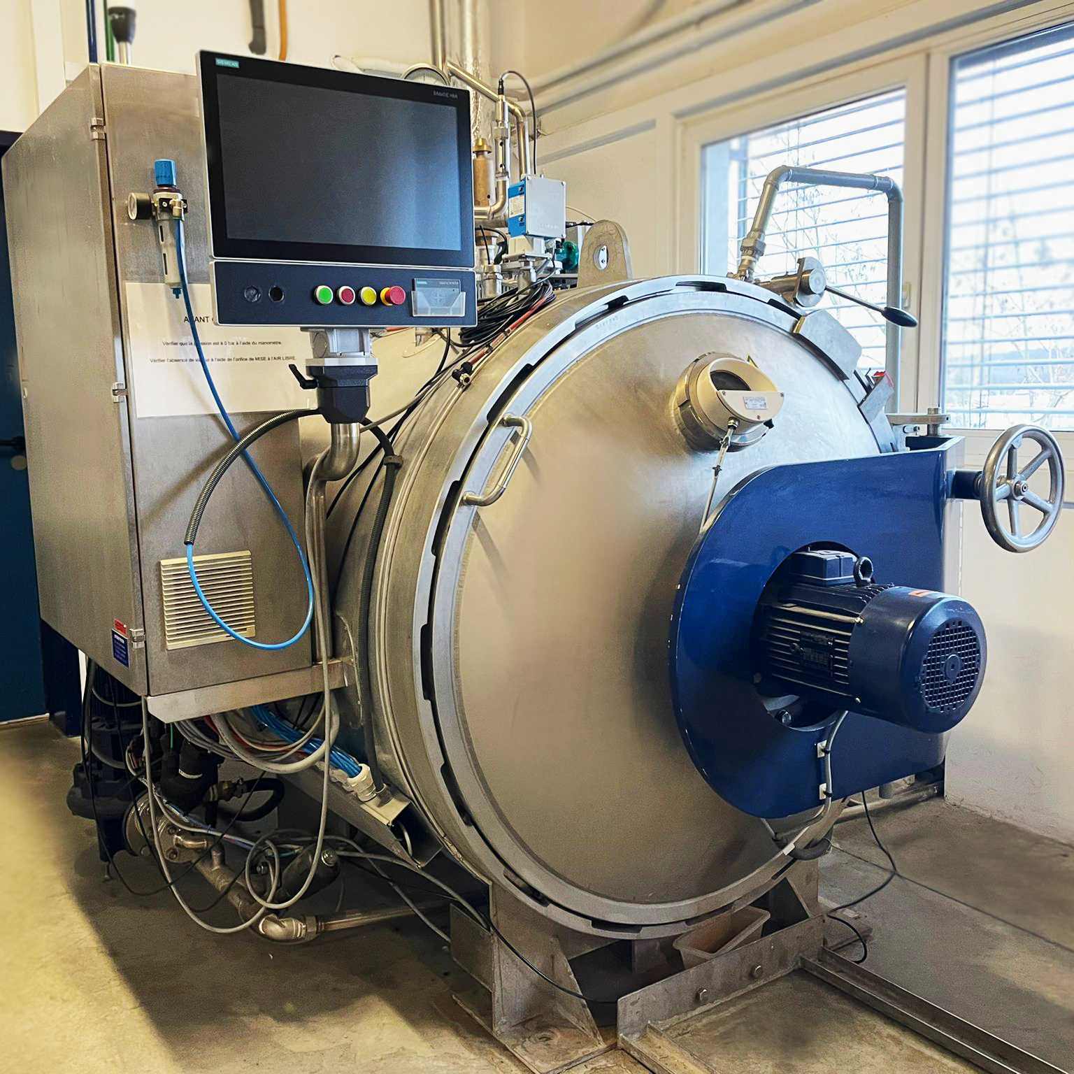 Autoclave piloto para reproducir el conjunto de los procesos: aspersión de agua, aire/vapor, bi-proceso, inmersión de agua, procesos con rotación o balancín (Rocking System)